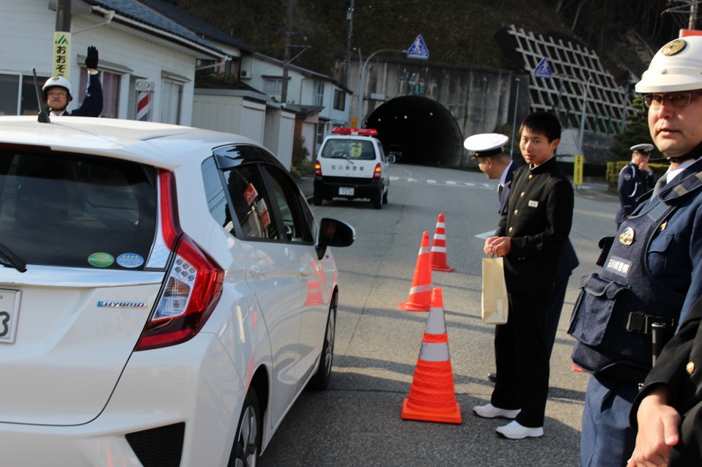 町野駐在所の方々と一緒に、朝JA前でドライバーお方々にマスコットを