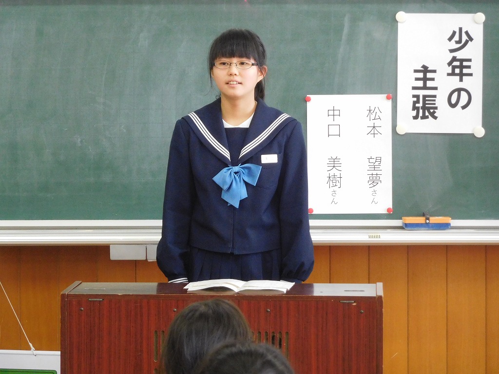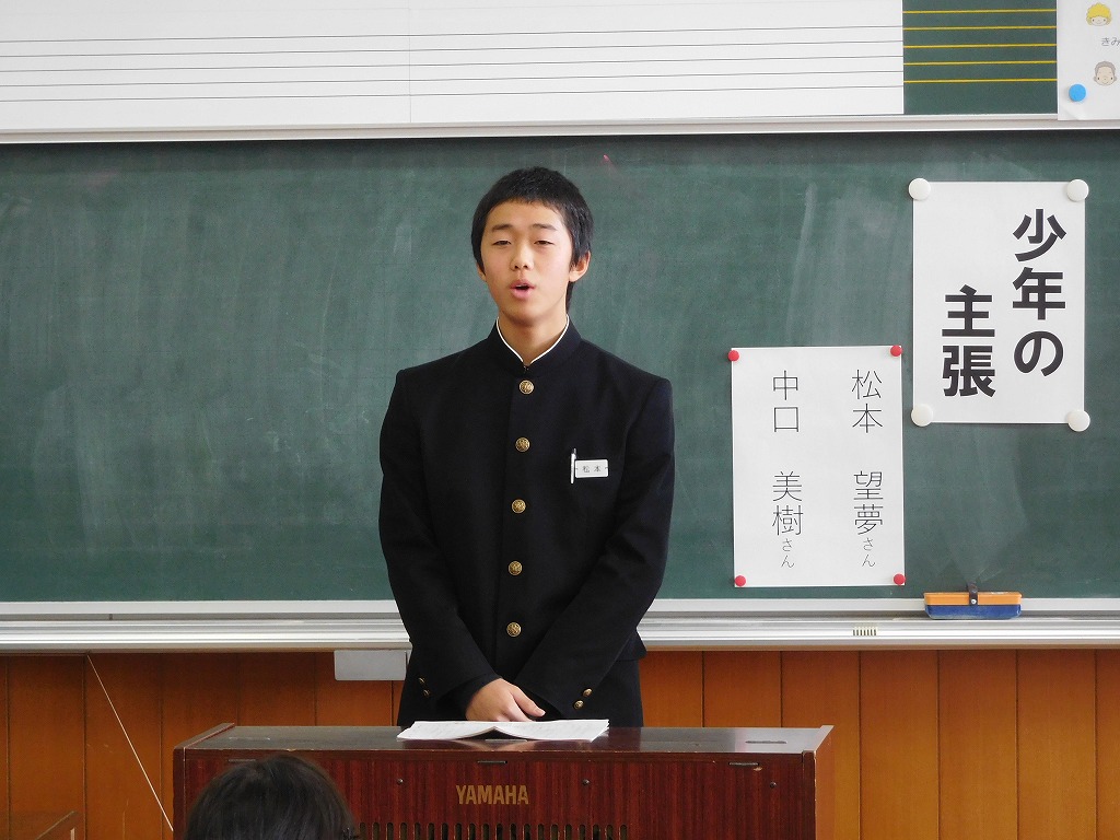 小の3~6年生に「少年の主張」を発表しました。小学生からは「東陽中の伝