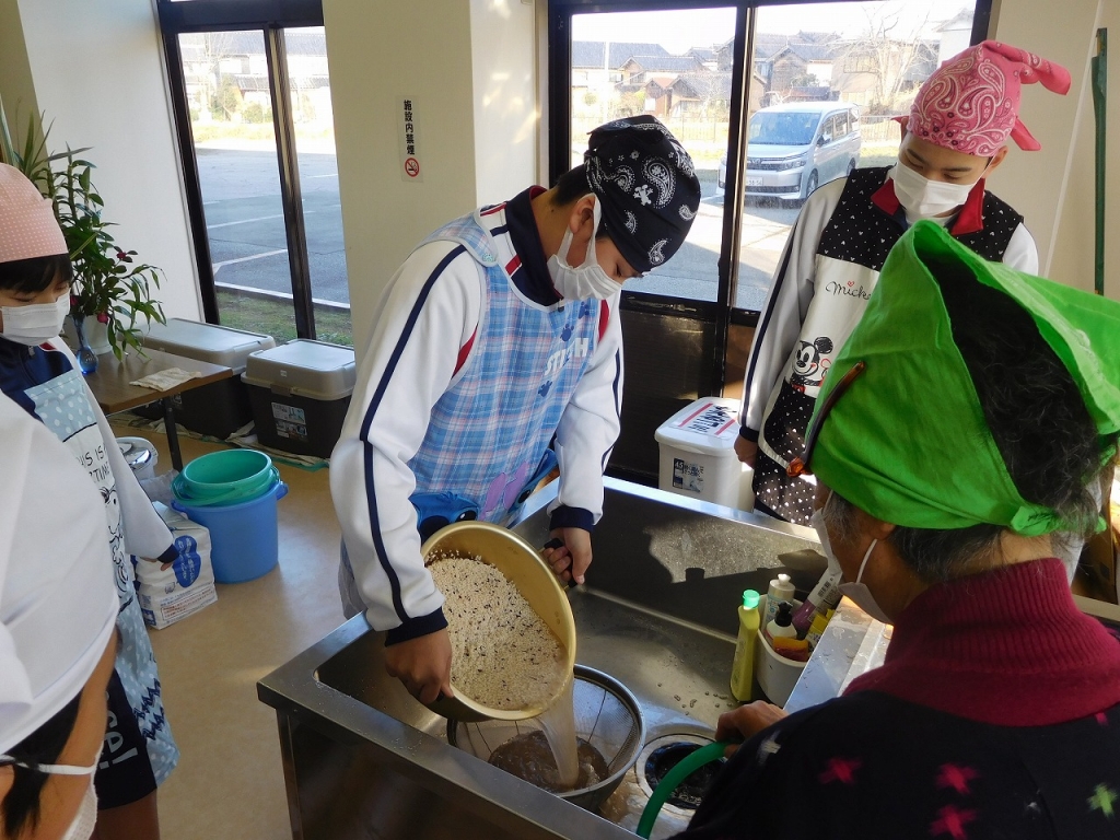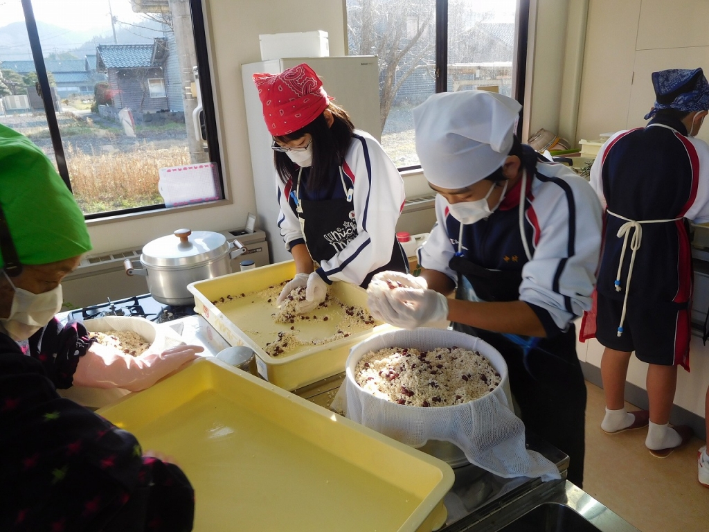 昨年、栽培し収穫した小豆ともち米を使って一年生が、赤飯作りに挑戦