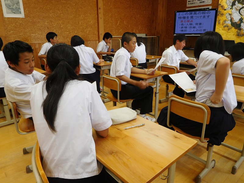 2年美術「風神・雷神の屏風をみて、色や表情・構図について考える。」