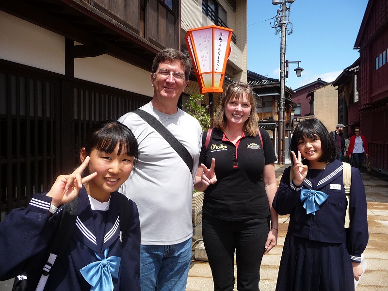 班で協力しながら、金沢の文化に触れ、観光客の方とも触れあいながら