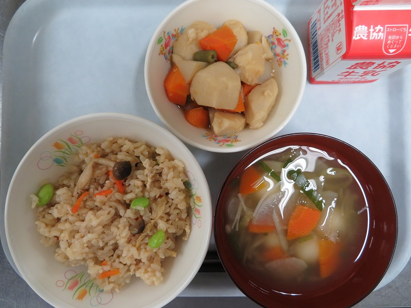 今日の給食は、里いも・白玉団子・きのこなどの秋の食材をたくさん使った