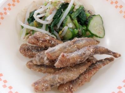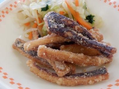 「いかのかりん揚げ」は短冊状に切ったいかに、米粉と片栗粉をつけて揚げています。甘辛い味つけで人気のメニューのひとつです。