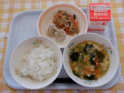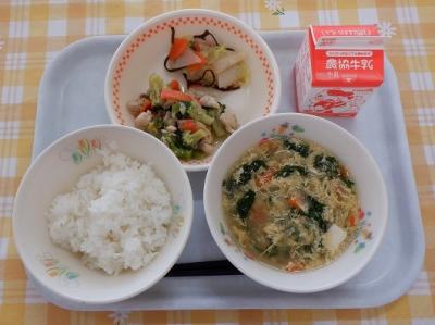 豚肉やチンゲンサイなどの具材を中華スープで味つけし、溶き卵を回し入れ、最後にごま油を入れて完成です。