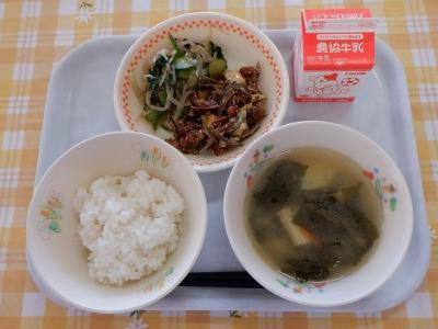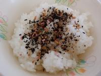 今日のふりかけは、『かむこと』を意識して食べられるように、歯ごたえのあるわかめ、ひじき、煎り米が使われています。