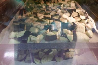 茄子は色止めするためにスチコンで加熱し、最後にカレーの釜に加えました。