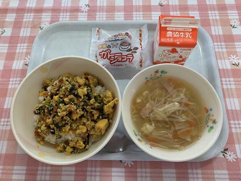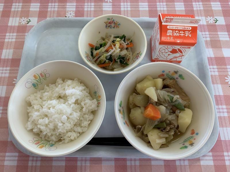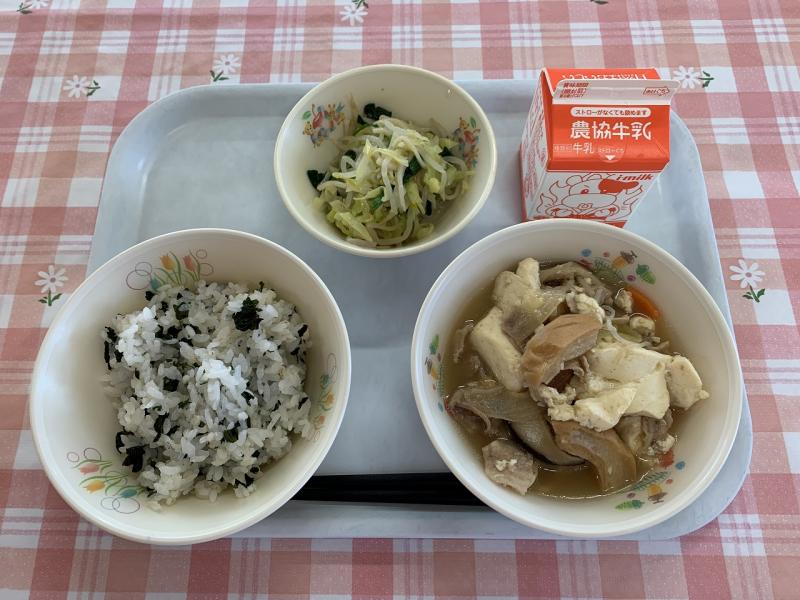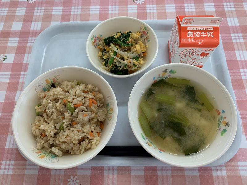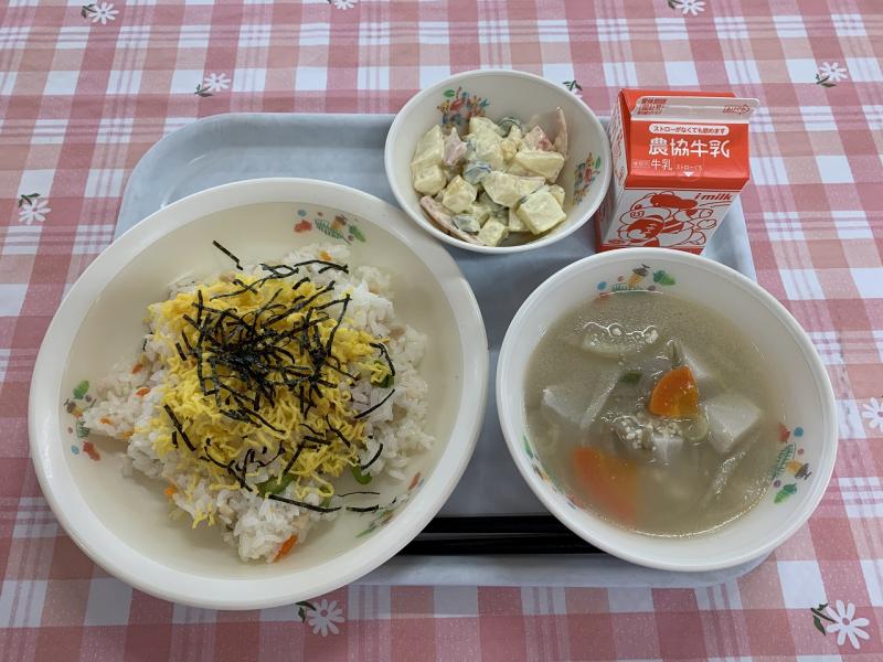 今日は、五目ごはんでした。薄味でしたが、鶏肉や油揚げ、ごぼうやしいたけなどのだしが効いていて、とてもおいしかったです。
