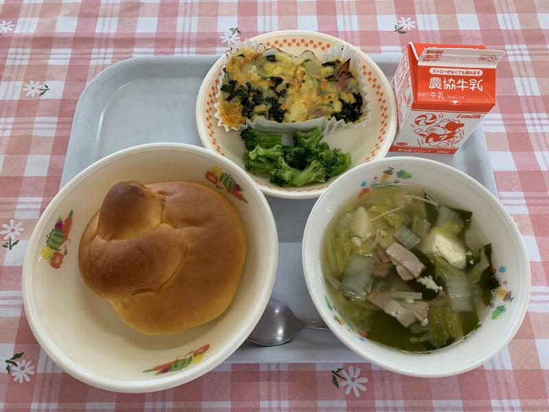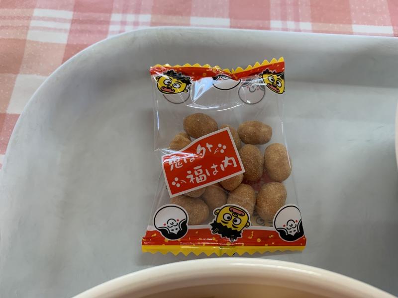 今日は、パンの日だったので、メニューは節分らしくありませんが、節分豆を付けて「節分給食」にしました。