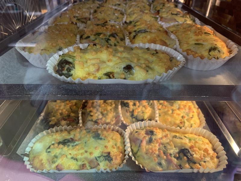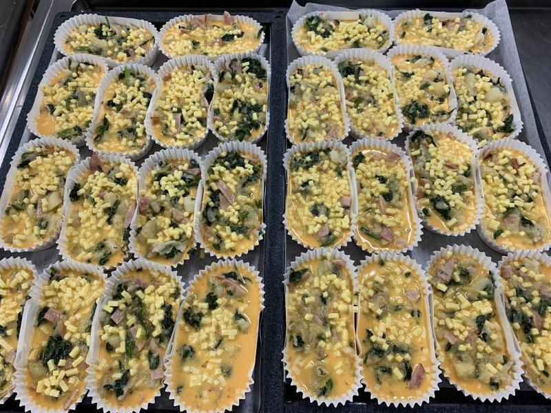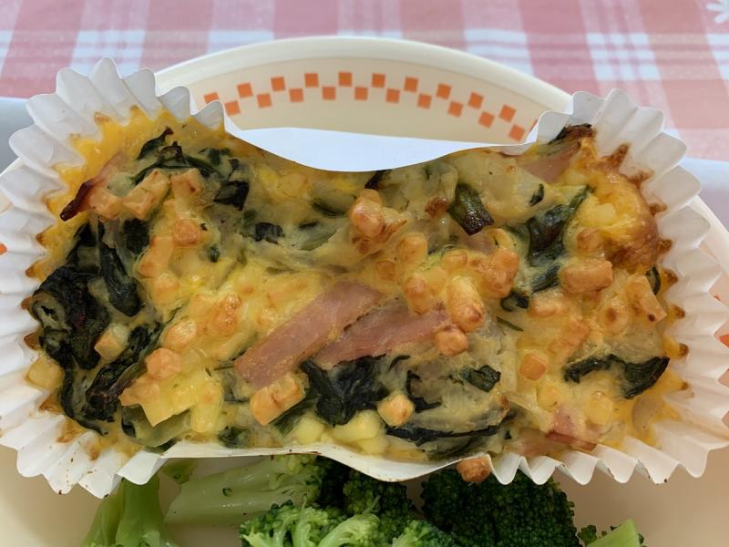 今日は、じゃがいものキッシュを手作りしました。角切りのじゃがいもを蒸して、ほうれん草はゆでておきます。ハムと玉ねぎを塩コショウして炒めたものに、じゃがいもとほうれん草を混ぜ合わせます。カップに入れ、角切りチーズと、牛乳と生クリームを混ぜた卵液を流し込み、スチコンで蒸し焼きにします。とても時間と手間がかかりましたが、優しい味に仕上がり、とてもおいしかったです。