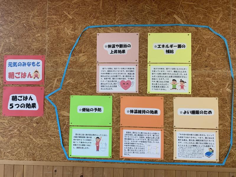 朝ごはんについての掲示物を作りました。1日の元気のみなもと「朝ごはん」をしっかり食べましょう!