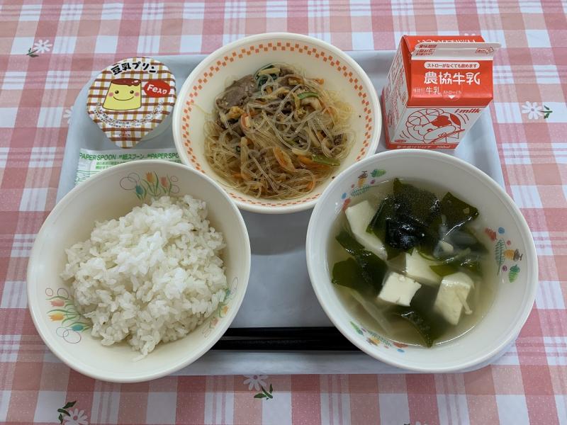 今日は、チャプチェが白ごはんにぴったりで、とてもおいしかったです。わかめスープは、あっさりとおいしかったです。