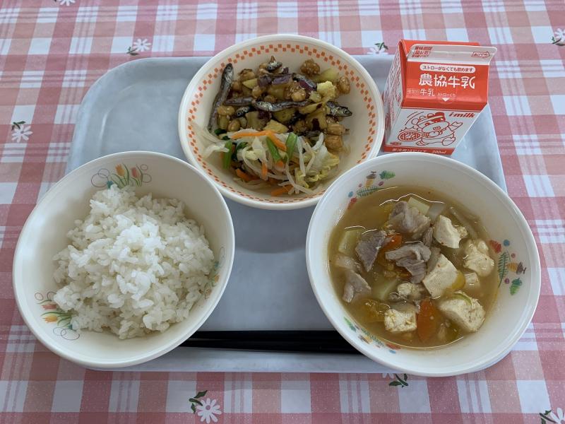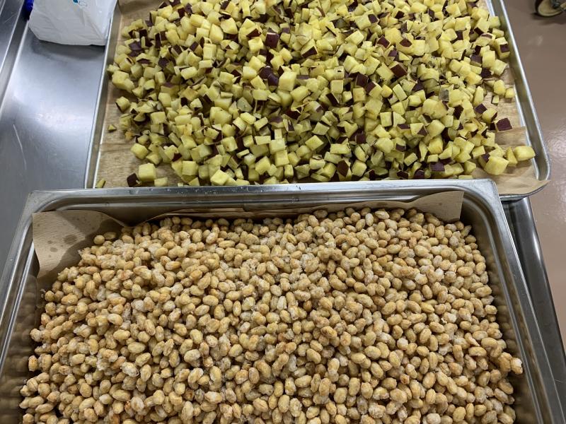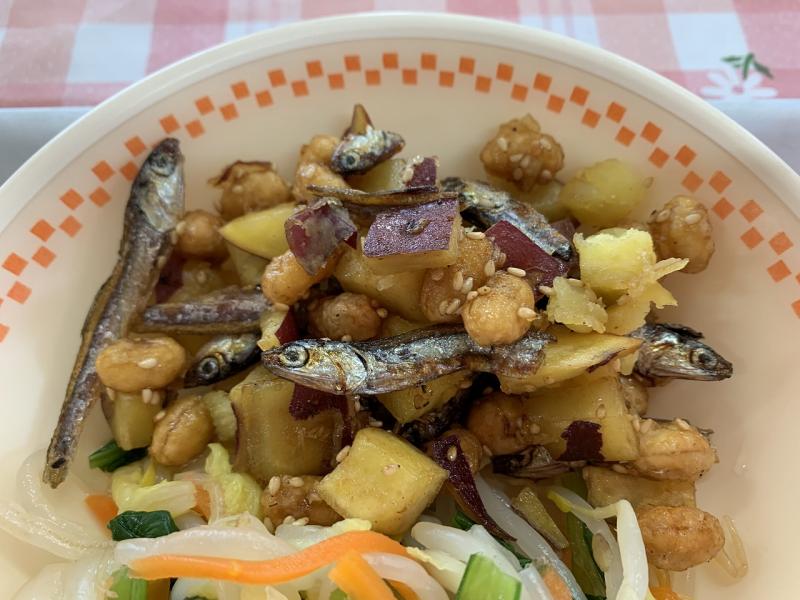 今日は、大豆と小魚の揚げ煮でした。さつまいもと小魚は素揚げ、大豆は水で戻し、片栗粉をからめて揚げ、甘辛いタレと白ごまをからめて作ります。小魚は、いつもより大きめのもので、少し苦みがありましたが、さつまいもとタレの甘みで食べやすくなっていました。かみかみメニューなので、いつもより、食べ終わるのが遅かったですが、残菜はありませんでした!意外と人気メニューです。