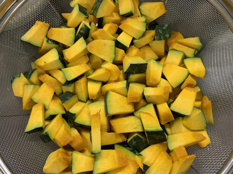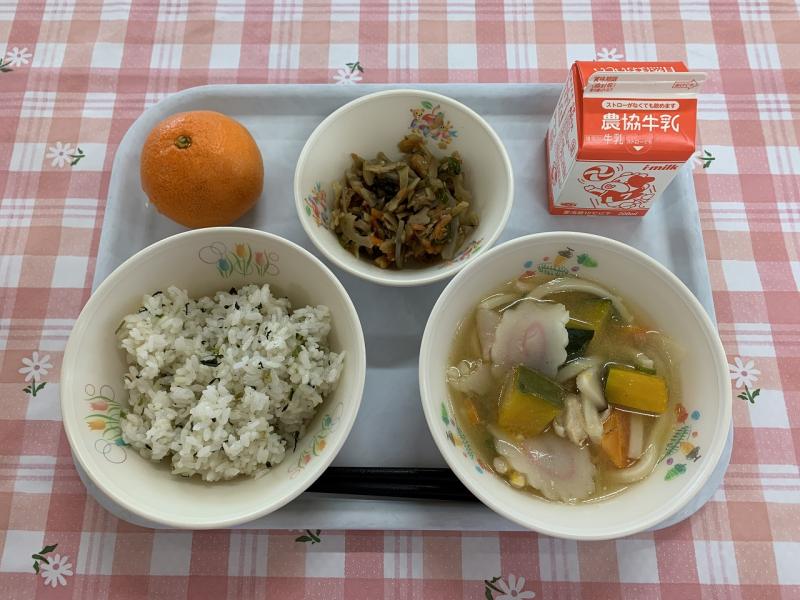 今日は、1年でもっとも昼が短く夜が長い日、冬至です。今日は、冬至に食べるとかぜをひかないといわれる「かぼちゃ」を使った〝ほうとう風スープ”です。かぼちゃの他にも、冬至に食べると「運」を呼び込むといわれる、「ん」が2つ付く食べ物をいくつか入れました。【なんきん(かぼちゃ)、にんじん、れんこん、う(ん)どん】また、1つだけ「ん」が付く食べ物もいくつか入っています。【だいこん菜、だいこん、みかん、ピーマン、ごはん、きんぴら】かぜをひかずに、元気に1年過ごしてくださいね。
