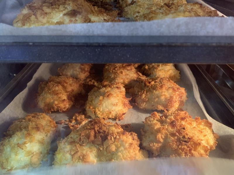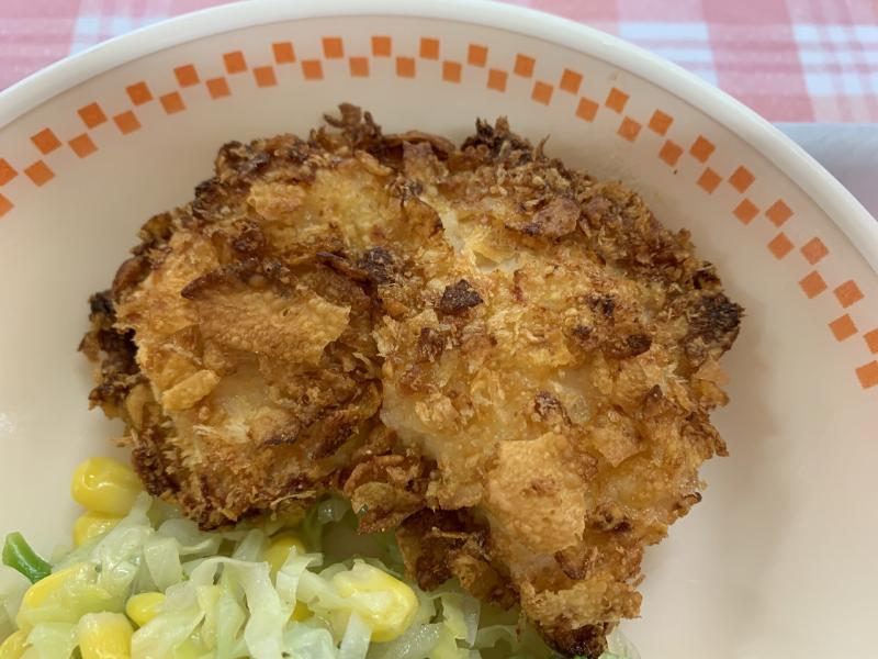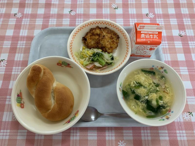 今日は、クリスピーチキンを作りました。鶏胸肉に塩コショウとマヨネーズで下味を付け、粉チーズ、パン粉、コーンフレークを混ぜて付け、オーブンで焼きます。衣はサクサクで、肉はやわらかく、とてもおいしかったです。今日は、午後から通知表渡しで、給食時間もあわただしく、いつもより時間が短めでしたが、早めに食べ終わっていました。卵スープもやさしい味で、おいしかったです。