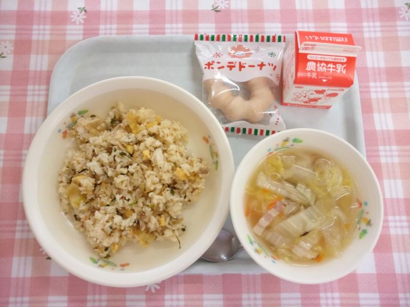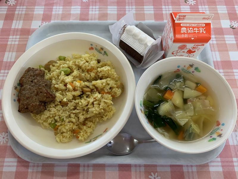 今日で2学期の給食も終わりです。今日は、クリスマスメニューでした。カレーピラフの上に、もみの木型のハンバーグをのせました。カレーピラフはスパイシーでとてもおいしかったです。2学期の給食も無事終えることができました。来年の給食づくりもがんばりますので、ご理解とご協力をお願いいたします。