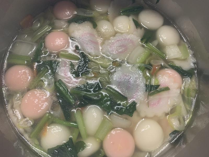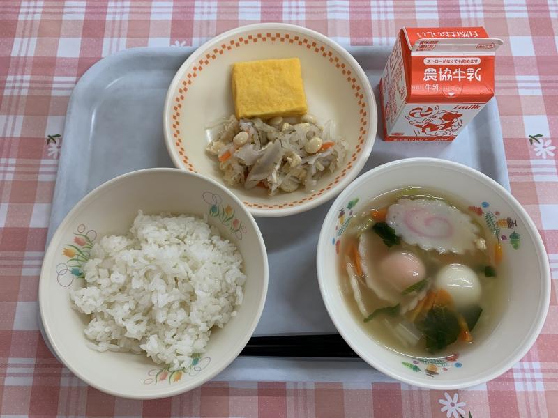 今日から3学期の給食が始まりました。今日は「鏡開き」の日なので、紅白のお餅を使って、白玉雑煮を作りました。鶏や昆布などのだしが効いたおいしいお雑煮でした。