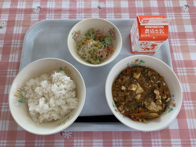 今日は、マーボー豆腐でした。給食のマーボー豆腐は豆腐やひき肉の他にも、大豆ミートやたまねぎ、にんじん、にら、たけのこなど、材料がたくさん使われているので、栄養満点です!