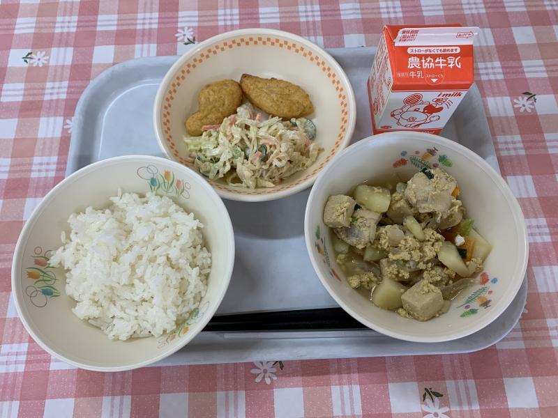 今日は、五目豆でした。大豆と人参、れんこん、ごぼう、ちくわの5種類に加えて、角切りにした昆布も入れました。大豆の香ばしさや、ごぼうの香り、れんこんのシャキシャキ感、竹輪と昆布の風味などが感じられ、とてもおいしかったです。少し濃いめの味付けだったので、白ごはんにもピッタリでした。
