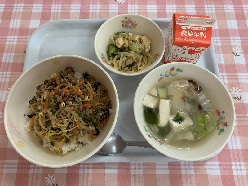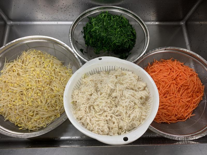 2021年12月17日 16時10分今日は、ビビンバでした。調理場に入ると、ビビンバに使われる野菜がとてもきれいだったので、写真を撮りました。最終的には、ひき肉と混ぜてしまうのですが、人参のオレンジやほうれん草の緑、大豆もやしの黄色は、混ぜてもキレイに残っていました。もちろん、とてもおいしかったです。