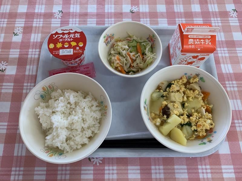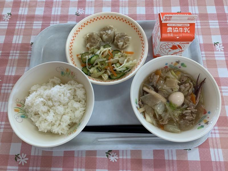 八宝菜は、イカのうま味が効いていてとてもおいしかったです。イカは小木産のスルメイカでした。白菜は、町野産です。和え物のキャベツも町野産です。とれたて地元食材は、とてもおいしかったです。