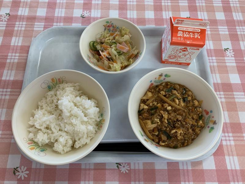 給食のマーボー豆腐は、豆腐やひき肉の他に、玉ねぎ、にんじん、にら、たけのこ、干ししいたけと食材をたくさん使っています。また、「大豆ミート」(大豆を肉のように加工したもの)もひき肉の半分の量が入っていて、栄養満点なマーボー豆腐です。