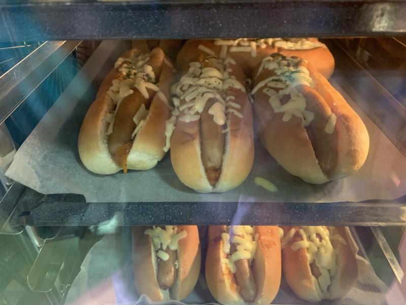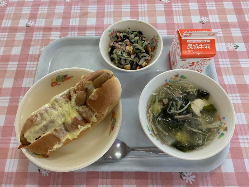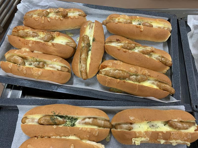 今日は、ホットドックを作りました。玉ねぎとピザソースなどを煮詰めてソースを作り、スチコンで蒸したウインナーと一緒にパンにはさみ、チーズをかけて焼き上げました。ふっくらとチーズもとろけて、とてもおいしく仕上がりました。大きいパンでしたが、残菜はありませんでした。