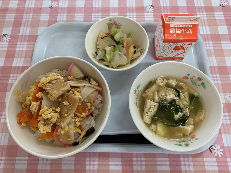 今日は、「木の葉丼」を作りました。生徒たちに「木の葉丼って何?」とよく聞かれましたが、さつま揚げやかまぼこ、椎茸を”木の葉”に見立てた卵とじ丼のことです。練り物と椎茸のだしが効いていて、とてもおいしかったです。