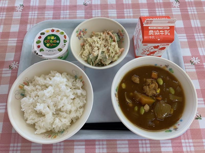 夏野菜のカレー煮には、かぼちゃ、コーン、枝豆、トマトが入っていました。
