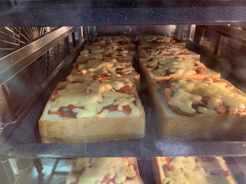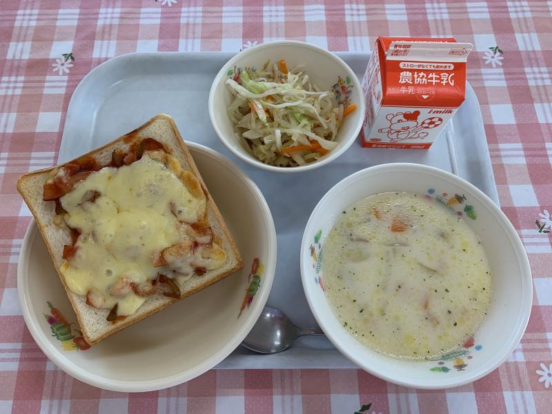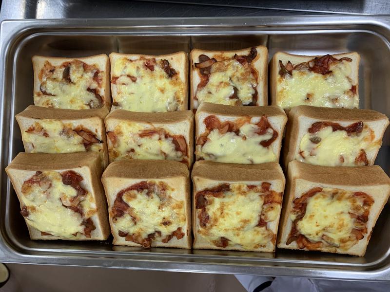 今日は、ピザトーストを作りました。中学校は、3㎝くらい厚さのある食パンで作ります。外側はかたいですいですが、中はふんわりとした食感です。