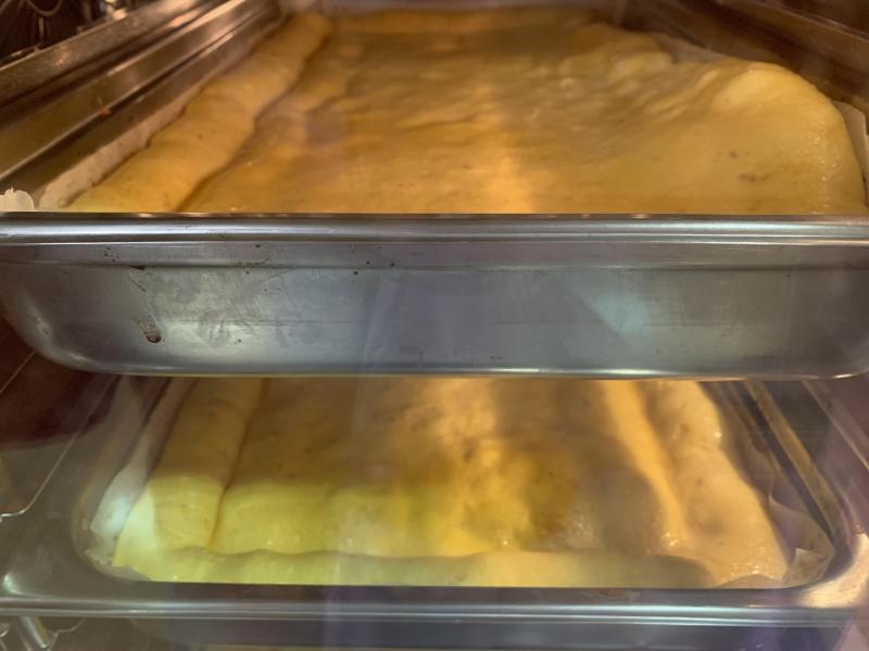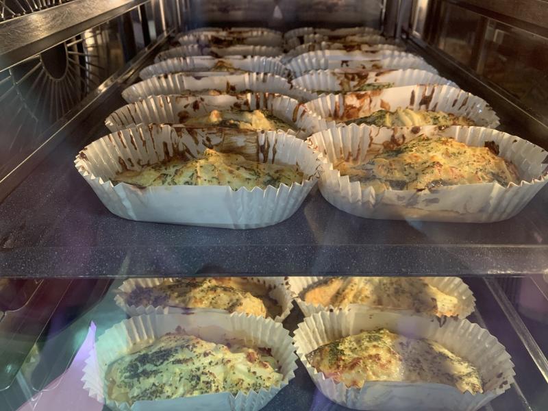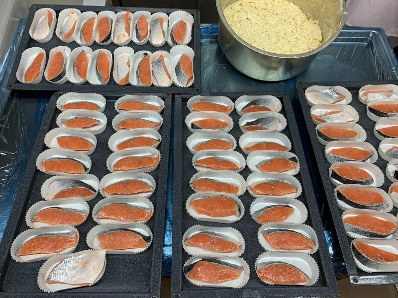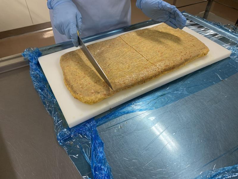 スチームオーブンで蒸し焼きにした後、人数分にカットします。均等にカットするのが、とても難しかったです。