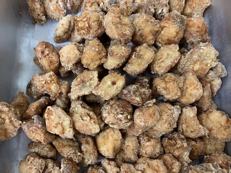 2回目は、しょうゆ等で味付けして、米粉を付けて油で揚げました。