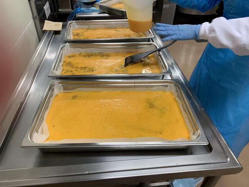 卵焼きを手作りしました。ひき肉と玉ねぎ、にんじんを炒めて味付けしたものをバットに入れ、その上から卵液を流し入れます。