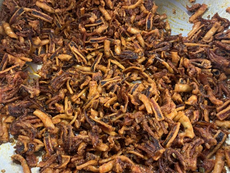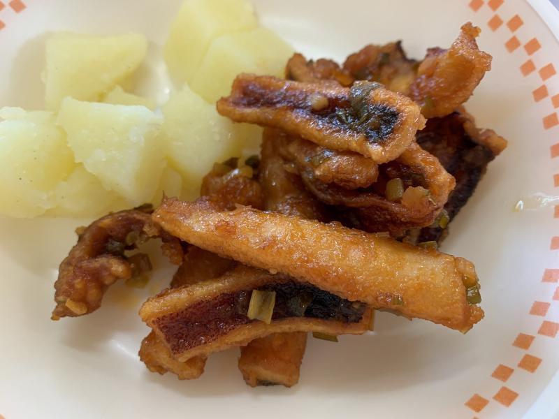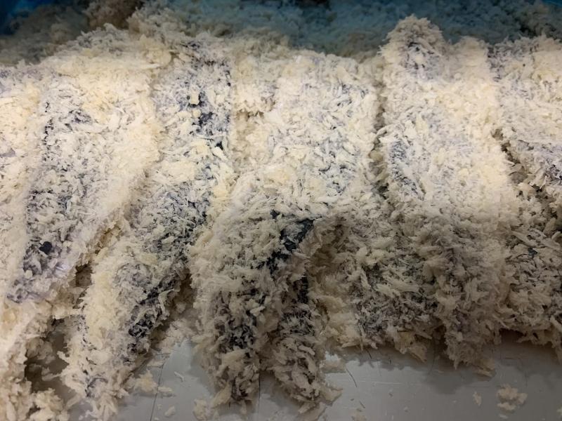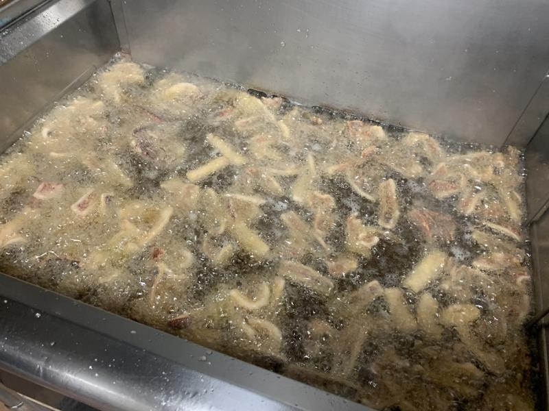 味付けして米粉を付けて揚げます。揚げると噛み応えもあり、おいしかったです。