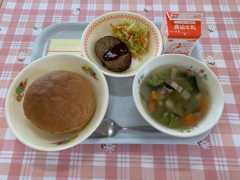今日は、セルフハンバーガーでした。パンの切れ込みは、調理員さんに入れてもらいました。