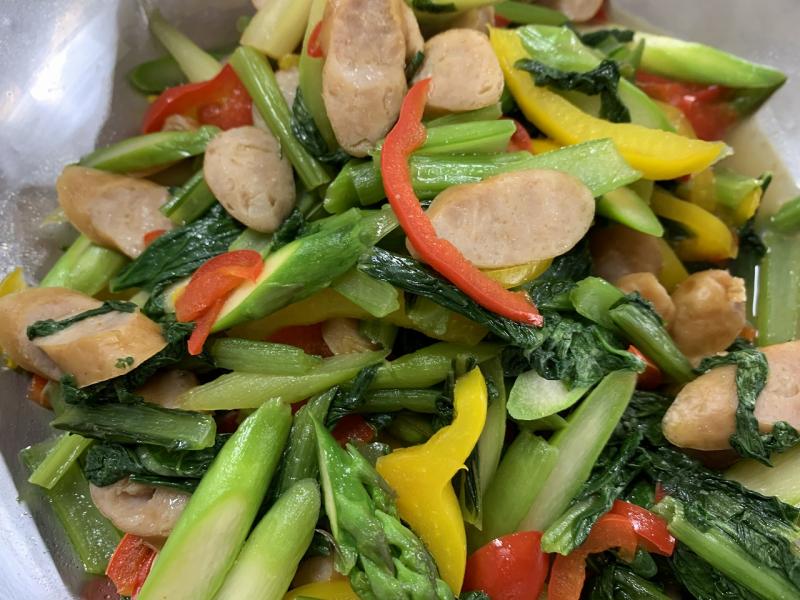 アスパラソテーは、パプリカや小松菜などのおかげで、とてもきれいにカラフルに仕上がりました。