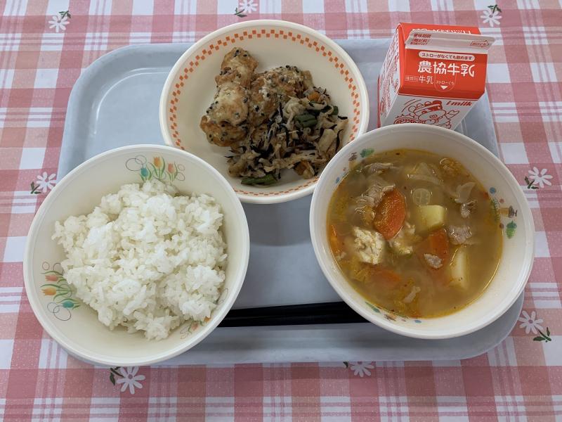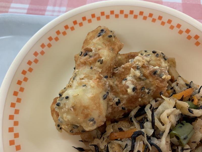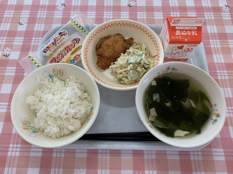 昨年度も鶏のから揚げ、白ごはん、かみかみサラダ、わかめスープが1位メニューでした。