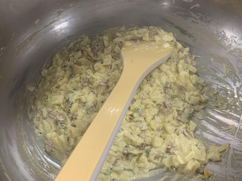 ポテトのごまみそ焼きは、蒸したじゃがいもと炒めた玉ねぎ、ピーマン、ウインナーを