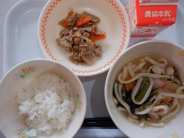 ・五目うどん(鶏肉、油揚げ、小松菜、人参、たまねぎ、かまぼこ等が入っています。)