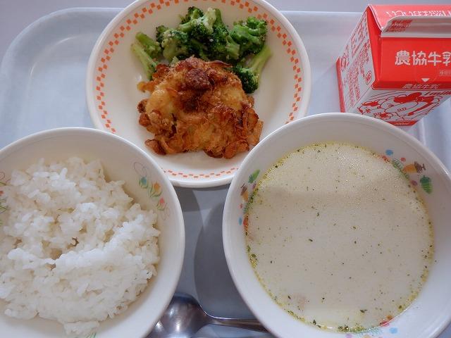 今月で一番気温が高い日となりましたが、チキンもしっかり食べてもらいました。写真では具材が沈んでいますが、クラムチャウダーには、じゃがいも・にんじん・たまねぎ・ベーコンが入っています。