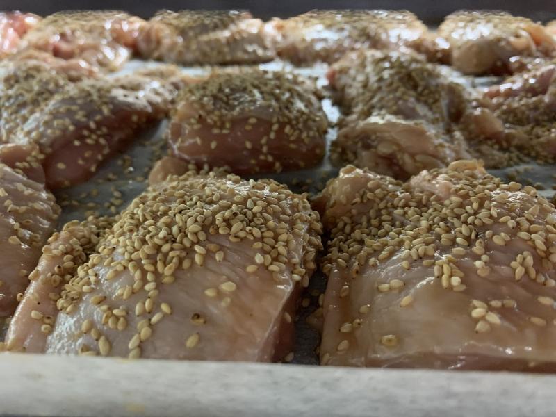 みそや砂糖の他に、ごま油も加えて下味を付け、ごまを振りかけて焼き上げました。