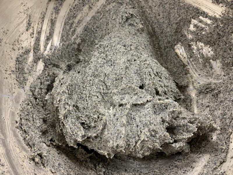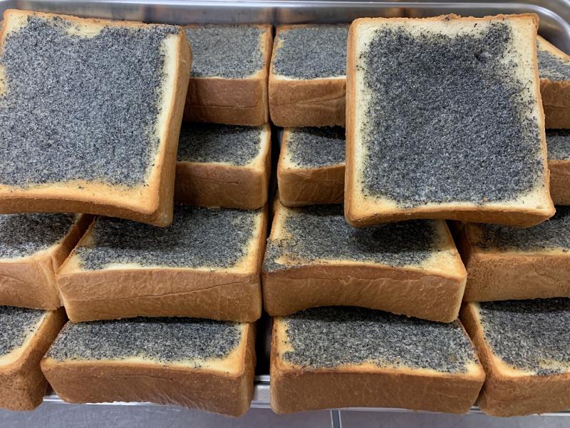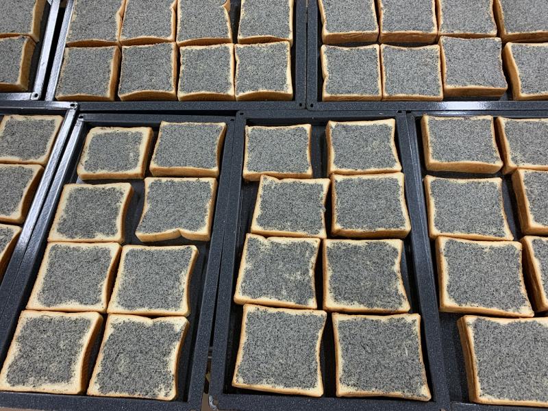 黒すりごまとマーガリン、砂糖を混ぜて、食パンにぬり、スチコンで焼きます。