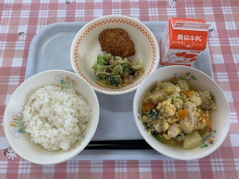 ジャガイモやたまねぎ、鶏肉、干ししいたけ、車麩等のたっぷりの具材を卵でとじて作ります。