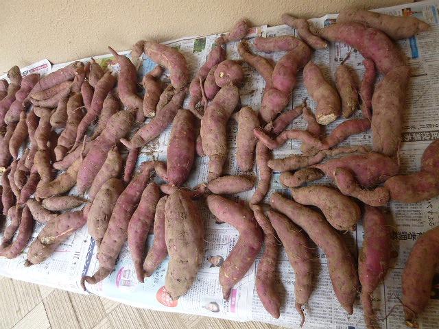 防災農園で収穫されたさつまいもを、日持ちさせるために、中庭に干しました。