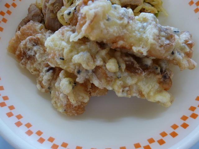ちくわの石垣揚げは、衣に白ゴマと黒ゴマを入れ、衣を石垣に見たててつくりました。(白ゴマが見えにくいですが…)