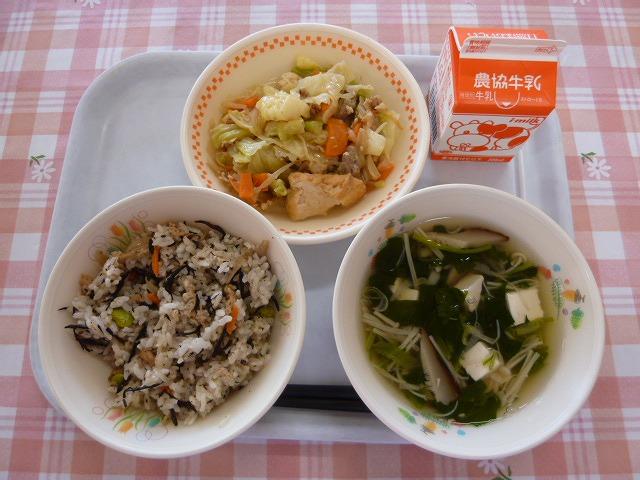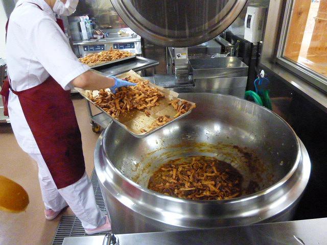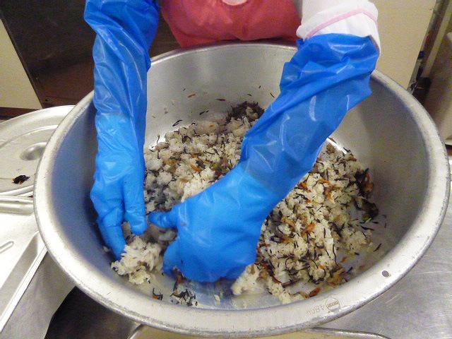 給食で混ぜご飯を作るときは、ごはんは、委託して炊いてもらっているので、混ぜご飯の具だけを作ります。