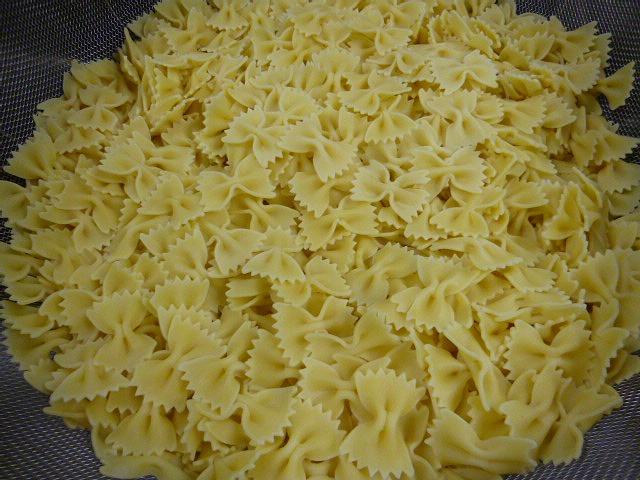 玉ねぎやひき肉、トマトソースなどで、ミートソースを作り、リボン型マカロニも加えます。