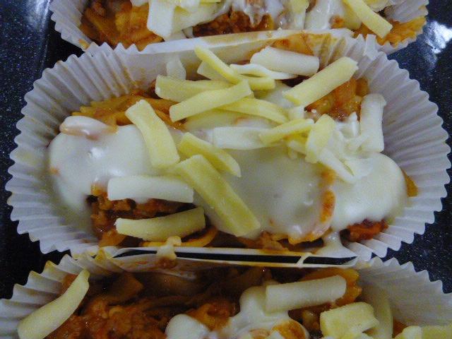 カップに入れたら、手作りのホワイトソース、とろけるチーズをのせて、チーズが溶けるまで、オーブンで焼きます。