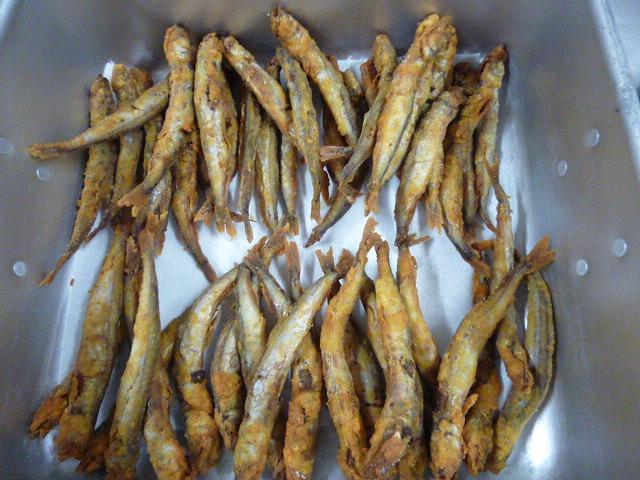 シシャモに料理酒としょうゆで下味をつけ、カレー粉を混ぜた片栗粉を付けて、油で揚げます。