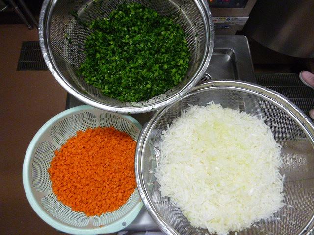 朝、給食室に入ると、にんじんのオレンジ、小松菜の緑、玉ねぎの白がとてもきれいで、思わず写真を撮ってしまいました。