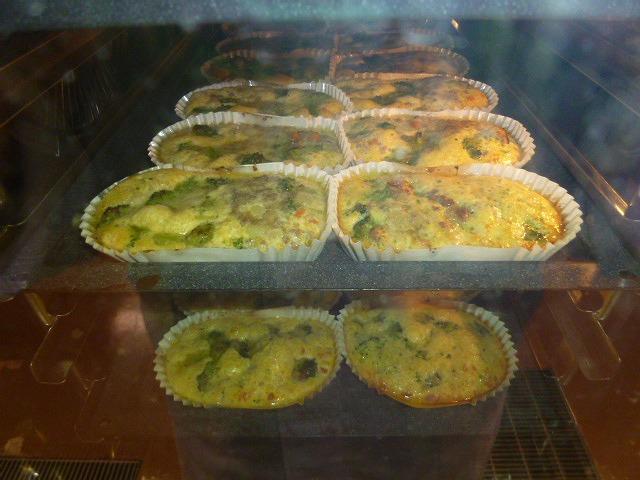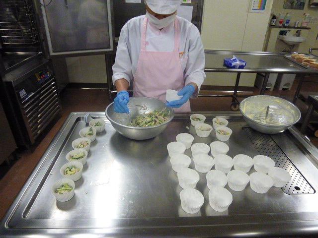 炒めて味付けしたひき肉、玉ねぎ、にんじん等をカップに入れ、その上から卵と牛乳を混ぜたものを流し入れ、スチームオーブンで焼いて作ります。